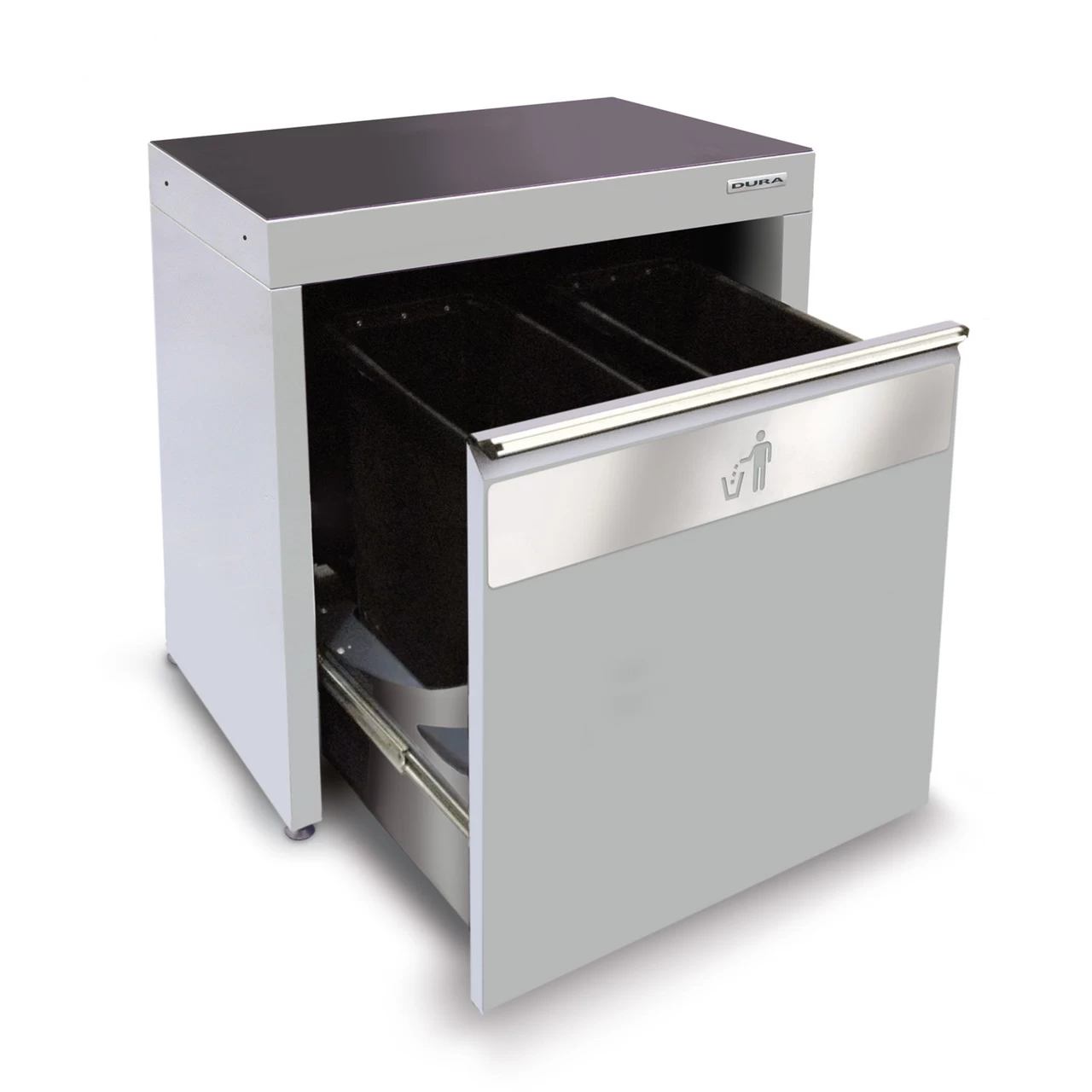 900mm wastebin cabinet, fitted with double doors to conceal 2 internal bins on castors. Hinged lid top on gas struts for waste access. Adjuastable feet.