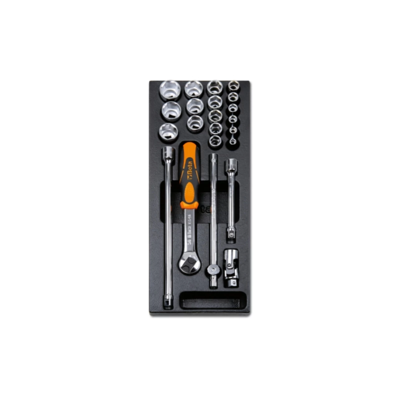 Beta T91 is a 22 piece 3/8″ socket set in a hard thermoformed tray.Â