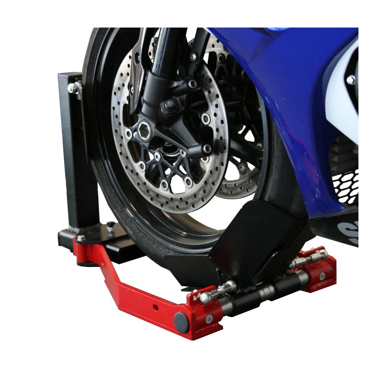 It can also be used in trailers or vans to good effect. Side support bars are available to enable freestanding use in a van or trailer, or for exhibitions etc. It will support wheels from 75mm to 220mm wide and will hold the bike upright – perfect for bikes without centre stands or where the side-stand allows the bike to lean over too far for safety.