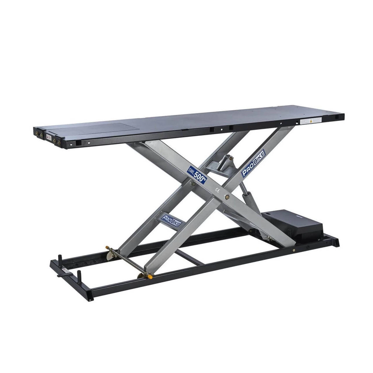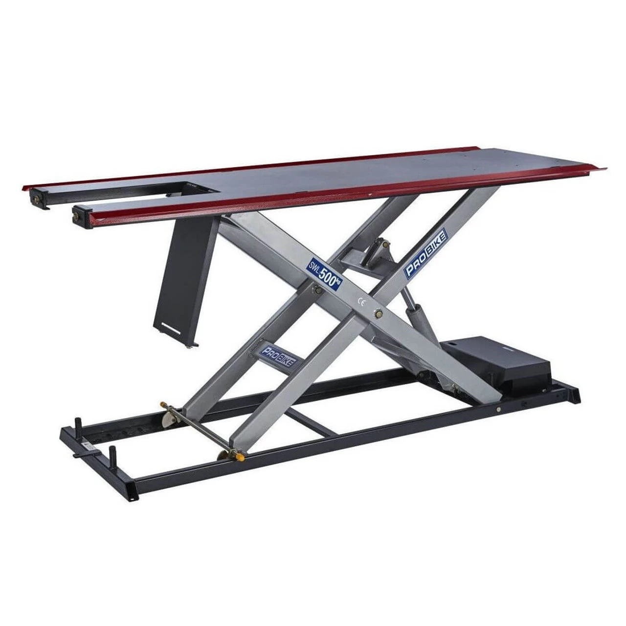 The EHS500 is a rugged pro quality Electro-Hydraulic lift at an affordable price. The EHS500 motorcycle lift is powered by an integral Electro-Hydraulic pump with a magnetic pendant handheld control switch – there is no separate pump unit taking up valuable workshop space. A drop-down rear wheel access panel helps you work fast and efficiently. The included bolt-on side trays are ideal for holding parts and tools while you work.