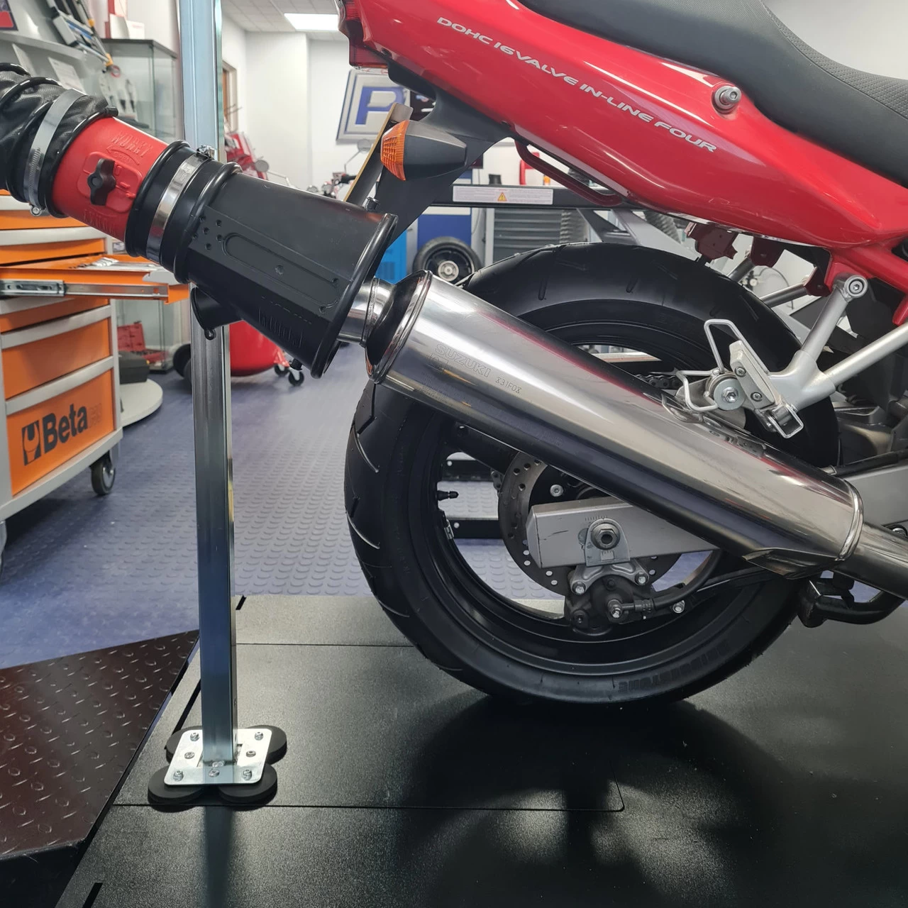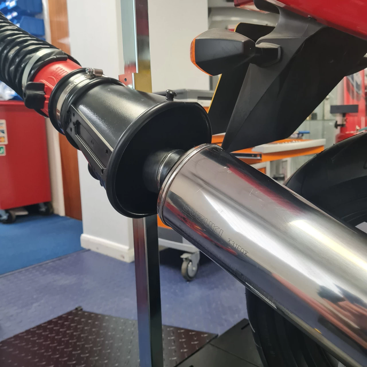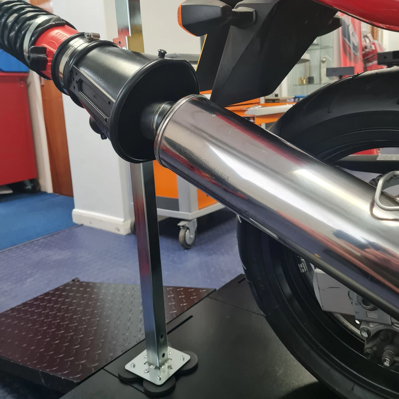 This Magnetic Exhaust Extraction Stand is the perfect solution to the problems faced using extraction systems with modern motorcycles. Due to the countless exhaust configuration options on today’s bikes, using a loose cone is not always straightforward. Low-exit angled / flush pipes are pretty much impossible to deal with.