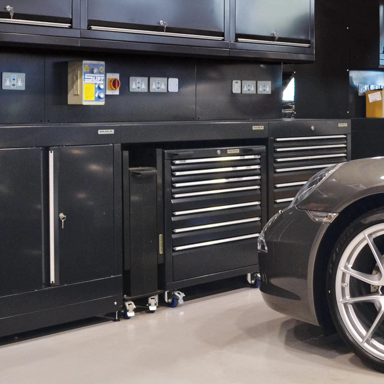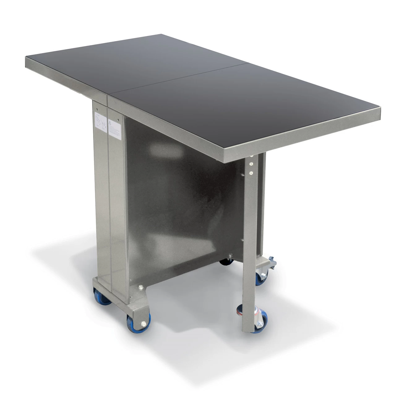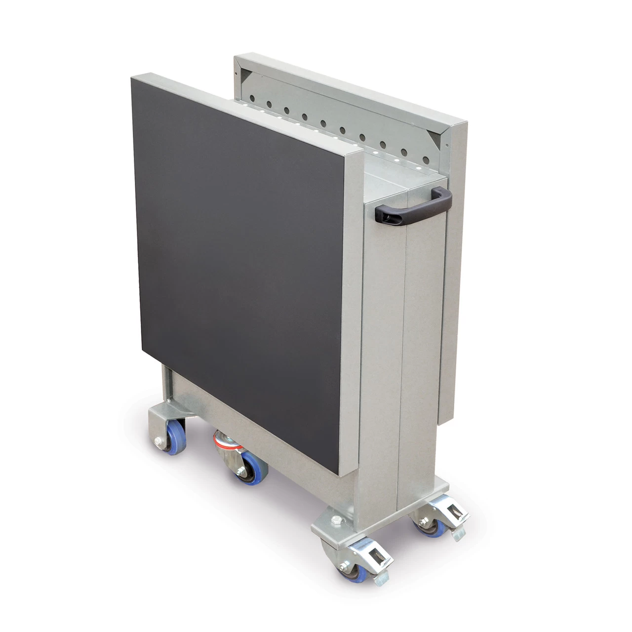 Folding workbench designed to collapse to a compact size to fit underneath bridging units. Fitted with heavy-duty composite worksurface and lockable castors.
