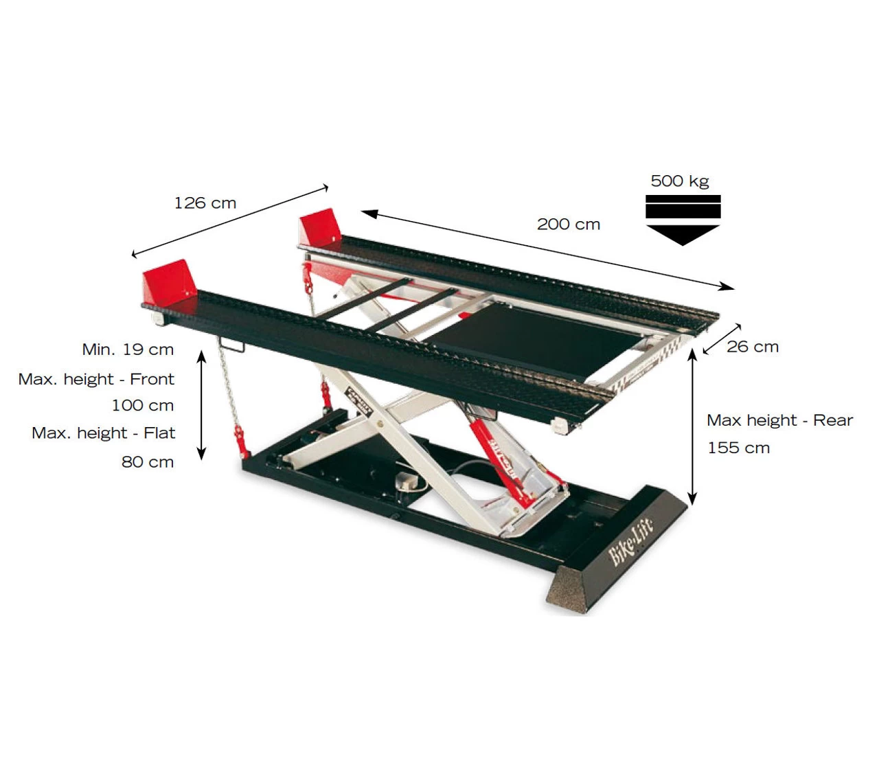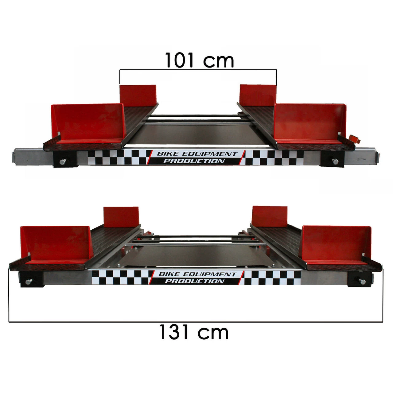 The tilting table allows unhindered and quick access to the lowest parts of the ATV or lawn tractor. It can reach a height of 100 cm at the front and 155 cm at the rear. Adjustable width from 110cm to 130cm.