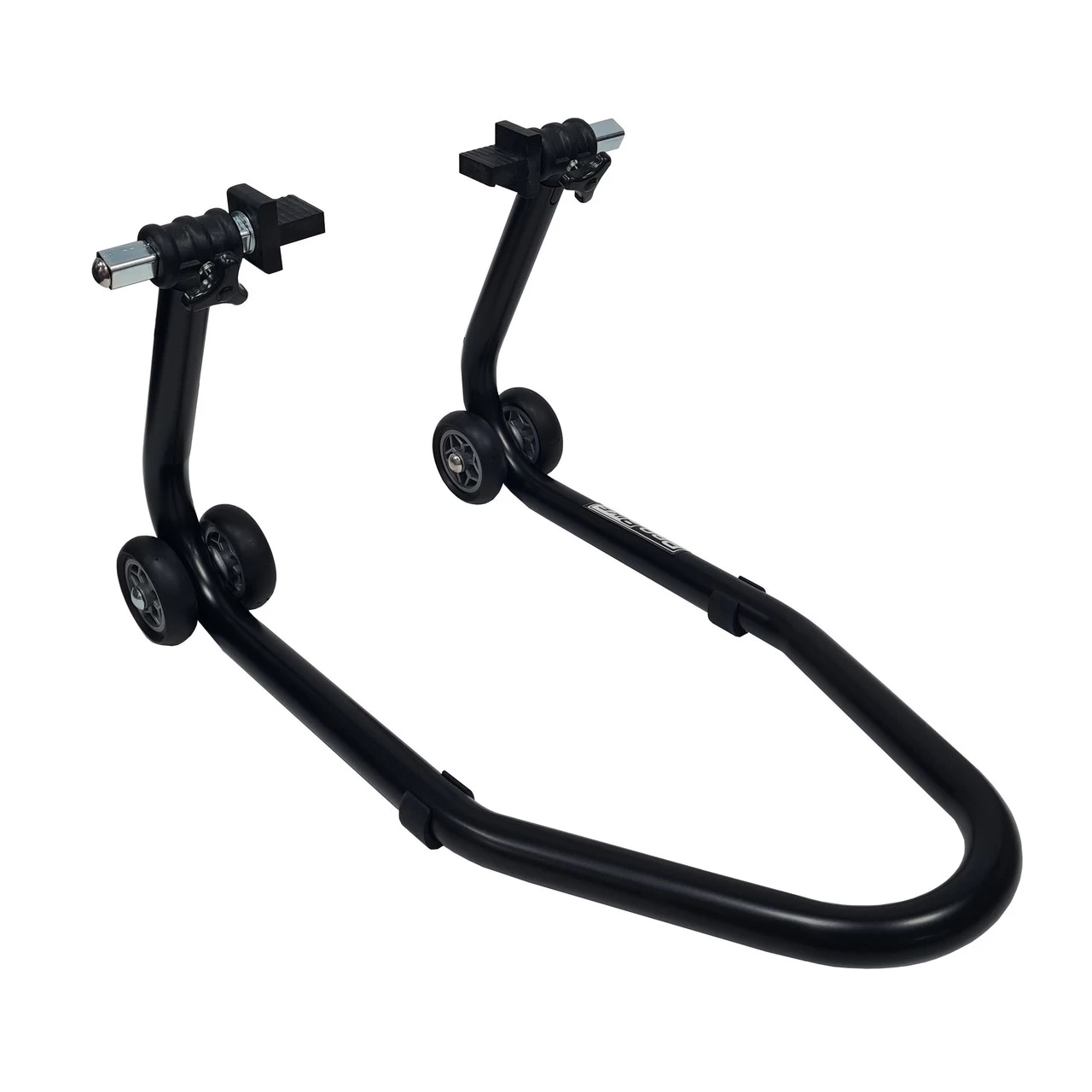 Front Paddock Stand for bikes with Radial Calipers. It lifts the bike using the radial caliper mounting brackets, leaving the front wheel spindle accessible. Fully adjustable for fork width.