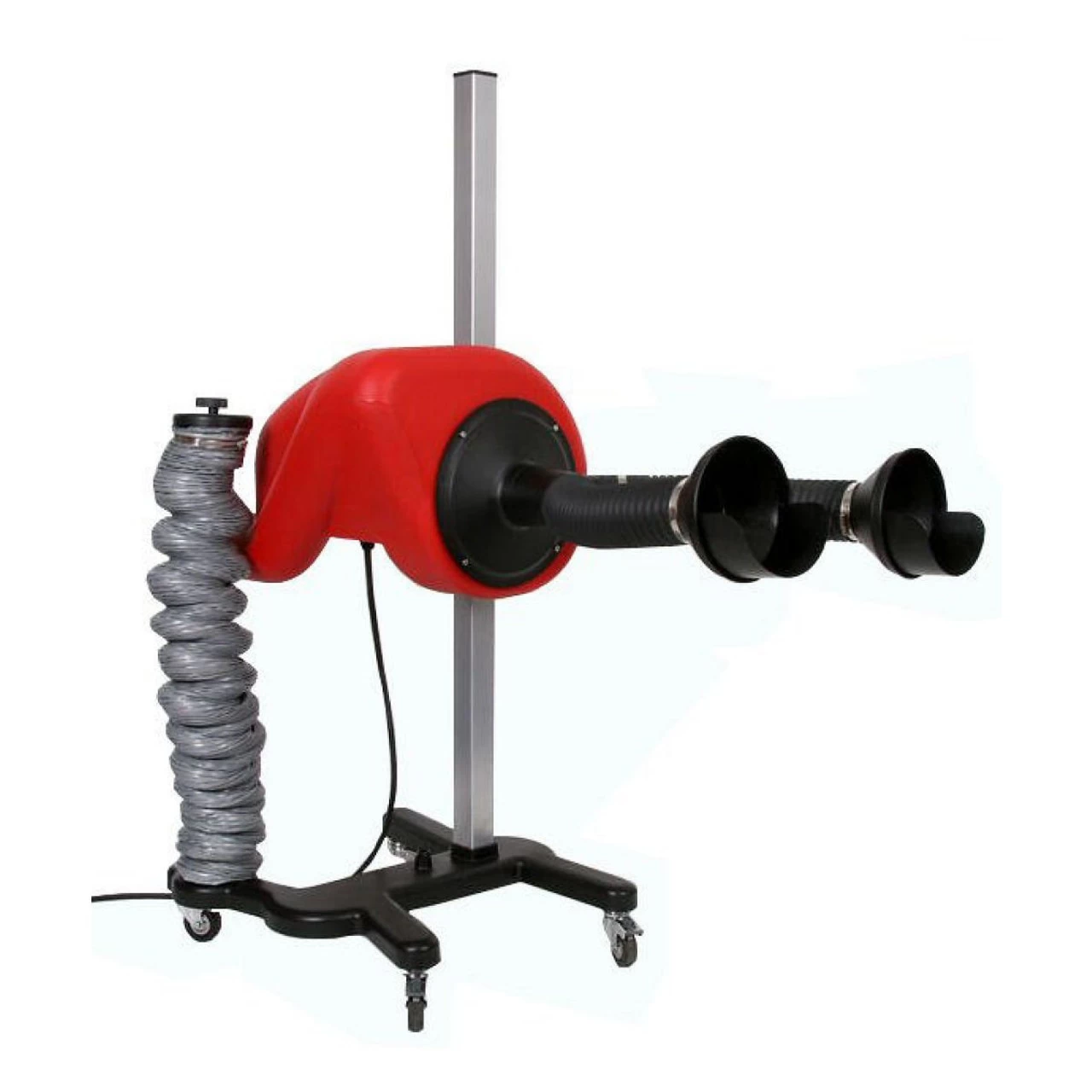This is a height-adjustable fan with an integral twin-cone collector system. Simply roll up to the bike, position the cones and route the supplied vinyl discharge hose out of the window or doorway for instant extraction. Ideal for bikes with underseat pipes.