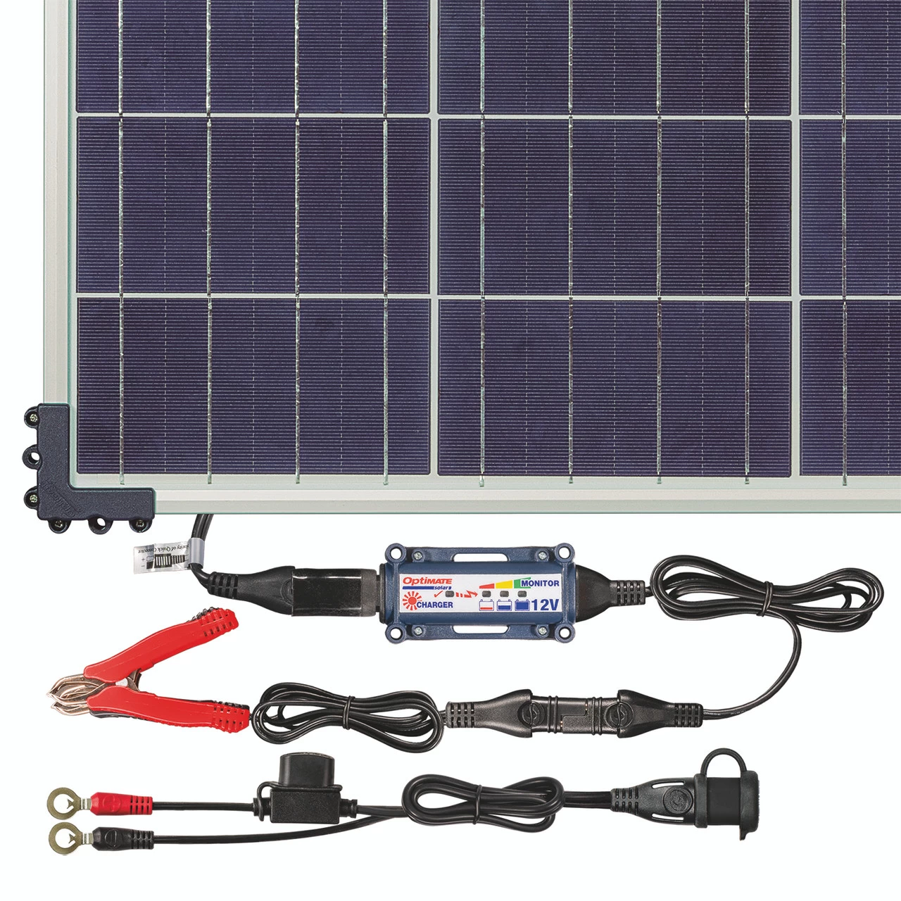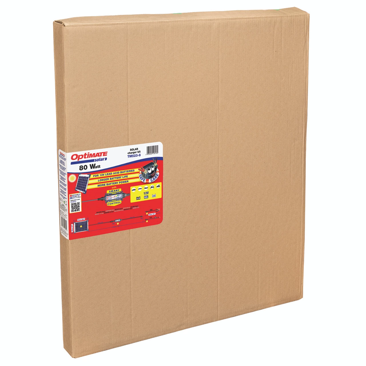 The 80W TM-523-8 kit (12V 6.7A max.) is ideal for all batteries from 20Ah upwards. The weatherproof solar panel includes corner mounts for easy wall or roof mounting. Each kit includes a high intensity poly crystalline panel with a 2m power cable, an OptiMate O-1 weatherproof battery lead, an OptiMate O-4 battery clamp lead and the outdoor rated OptiMate smart charger-controller (TM-522) with a 1m charge cable.