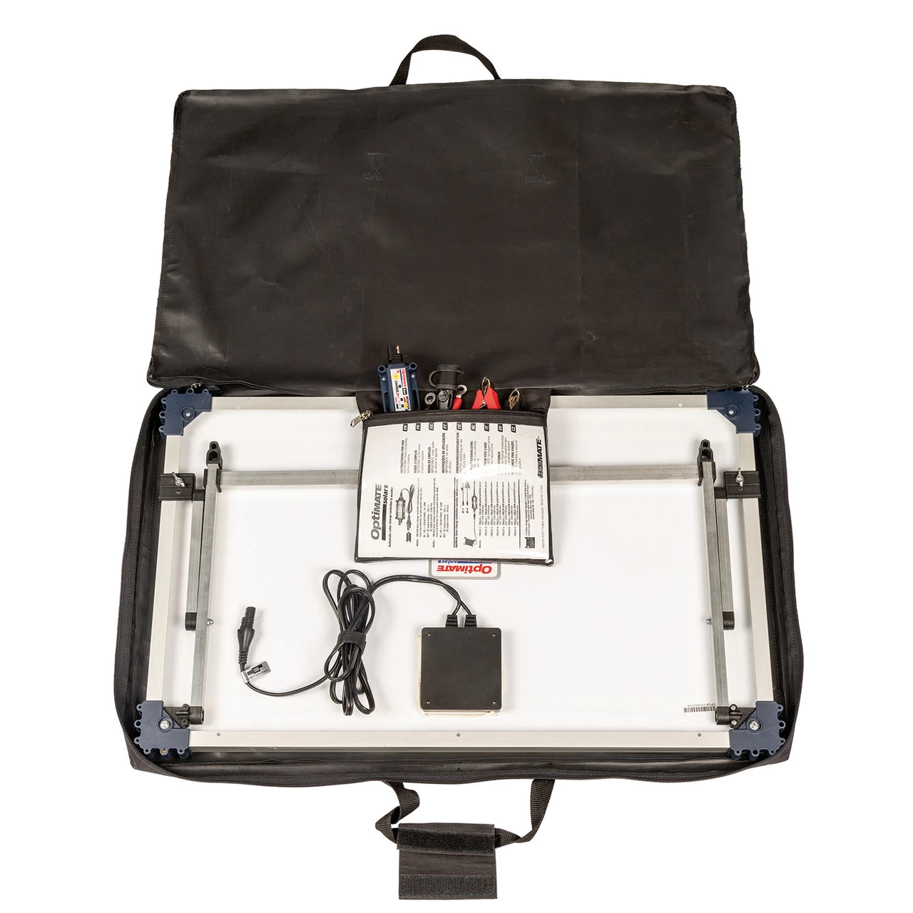 OptiMate Solar – the worlds most efficient Solar Pulse Charger, Tester & Maintainer. The travel kit also includes the premium OptiMate travel bag and adjustable stand. Adjust the panel to the most suitable angle for maximum solar power. Securing panel in position – 4 anchor points fit standard pegs / stakes (not included) or place a weight (e.g. sandbag) over the crossbar.