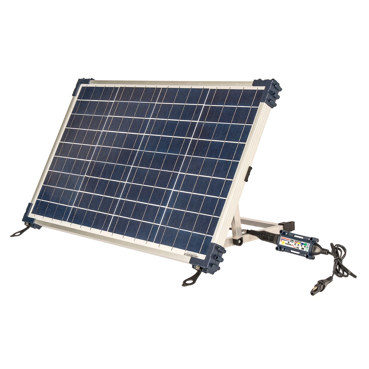 The 40W TM522-D4 kit (12V 3.3A max.) is ideal for all batteries from 10-160Ah. The weatherproof solar panel includes corner mounts for easy wall or roof mounting. Each kit includes a high intensity poly crystalline panel with a 2m power cable, an OptiMate O-1 weatherproof battery lead, an OptiMate O-4 battery clamp lead and the outdoor rated OptiMate smart charger-controller (TM522-D4) with a 1m charge cable.
