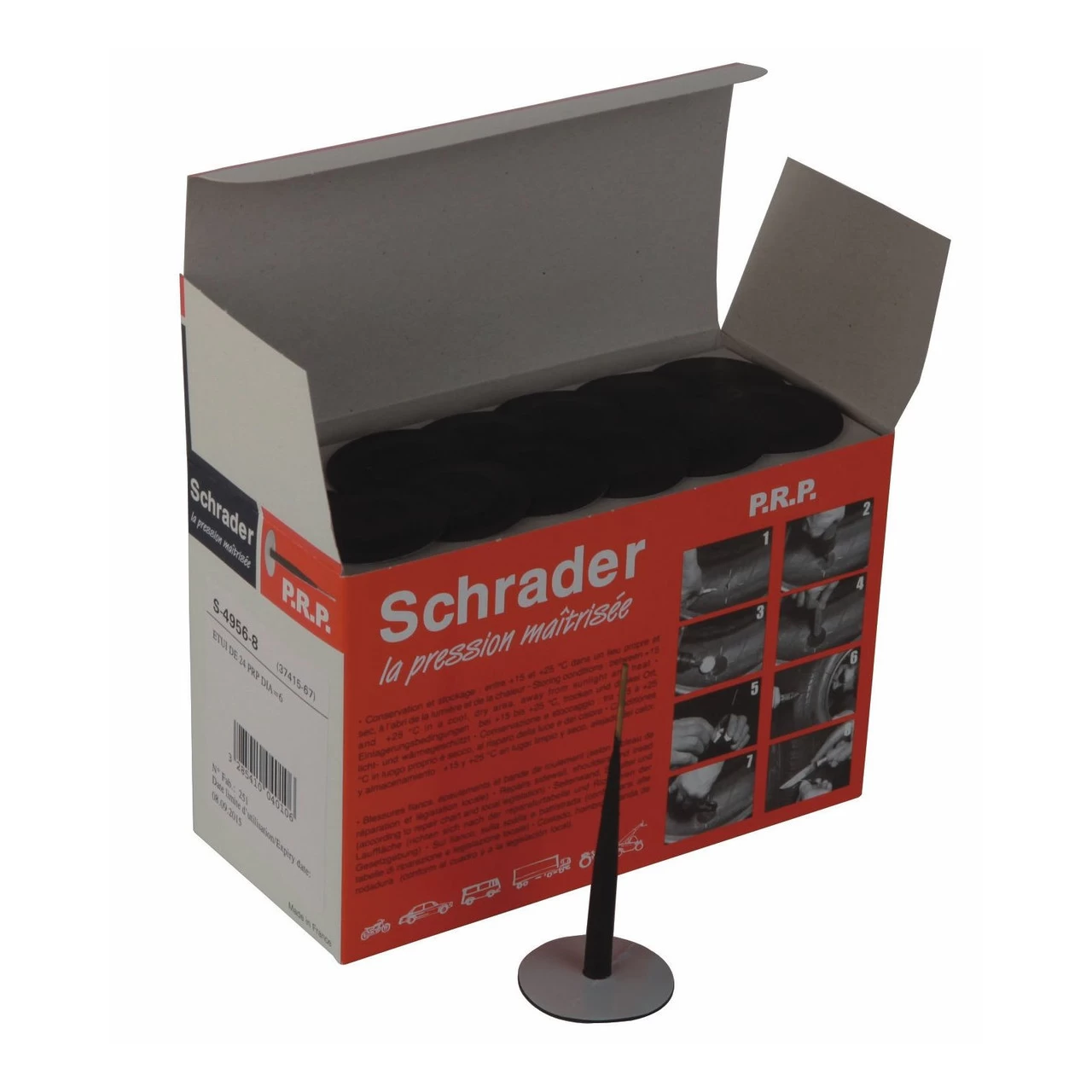 24 x 6mm high quality Schrader plug repair patches suitable for use in all types of tyres, subject to local regulations.