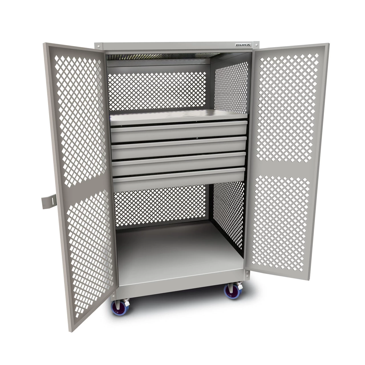 Lockable cage with four drawers for storing removed vehicles items securely. Supplied with lockable castors.