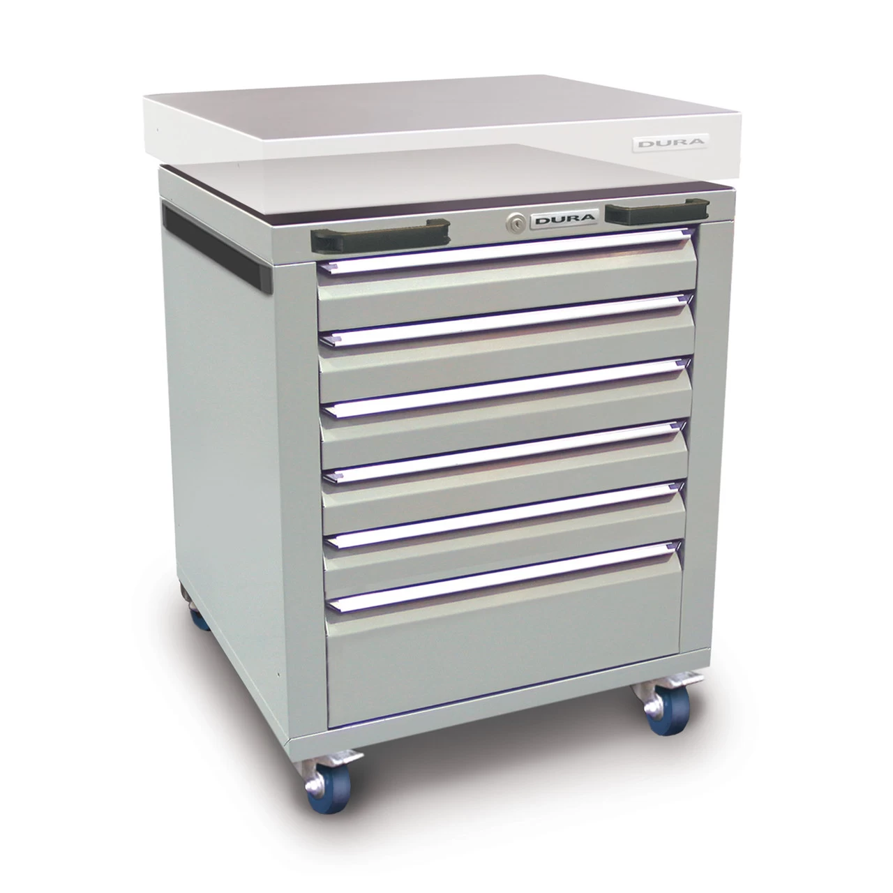 Drawers lined with foam and fully lockable. Lockable castors. Hard-wearing composite worksurface, with front handles.